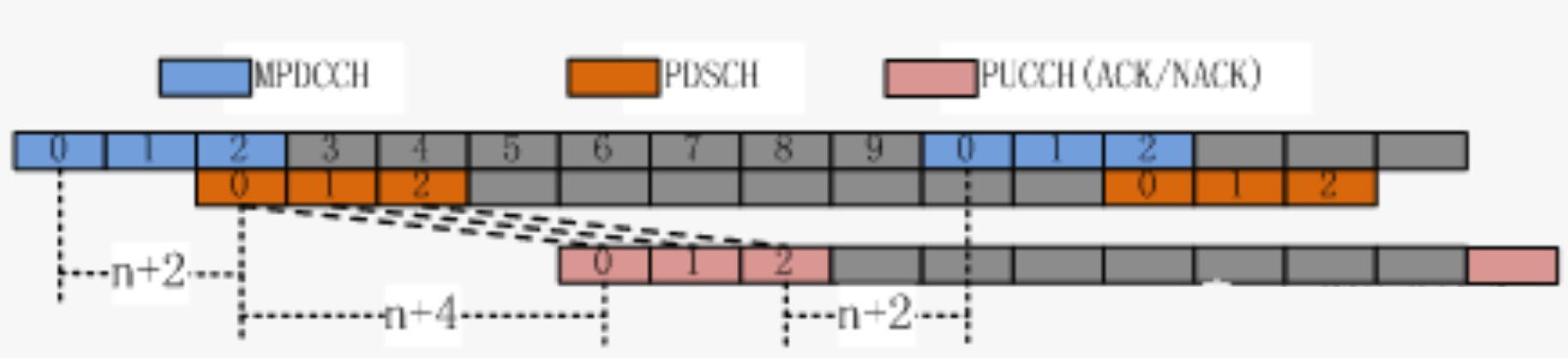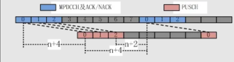 图2是信号条件较好的环境中,最优的上行调度时序,终端接收到MPDCCH调度后,必须等待4个子帧才能进行MPDCCH所调度的上行PUSCH数据发送,并且,上行/下行发送的切换间隔必须至少占用1个子帧。从PUSCH上行数据发送到基站在MPDCCH中进行ACK/NACK确认也需等待4个子帧。